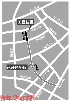 市民李先生说:“他住在艮山西路还要往北和运河的交界处,双休日经常开车带着老婆女儿到万象城去玩,现在都会选择走新塘路-庆春东路-富春路,由于地铁施工,庆春东路和新塘路的路况一直不容乐观,特别是庆春东路,从早上堵到了晚上,要是遇上高峰期,大概要开40分钟左右。如果钱潮路的艮山西路到严家弄路建成开通后,就可以直接走钱潮路,再走富春路就到万象城,这样多省事啊。”确实,钱潮路(艮山西路—严家弄路)开通后,不但缓解了新塘路等南北向道路压力,也有助于改善运河西侧地块的南北向交通。